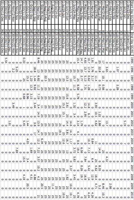 Using the information provided in Task 1, it is now time to begin developing an index for Village X. In this task you will decide on appropriate index windows (start and end dates) for both the planting and flowering phases of the season; these two phase are intended to target the periods in which farmers identified their crops as being most vulnerable to drought. Be sure to come to a consensus in your group, and make use of the dekad conversion table on the next page.