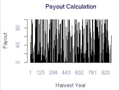 Although the mean payout is higher for the simulated payout series (as would be expected), the variance in the payouts is actually lower. How is this possible and what does it say about the changes in payouts? This means that the index and increased variance in the data interact in such a way that there are fewer full payouts but more small payouts, increasing the mean payout but decreasing the variance.