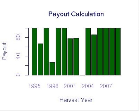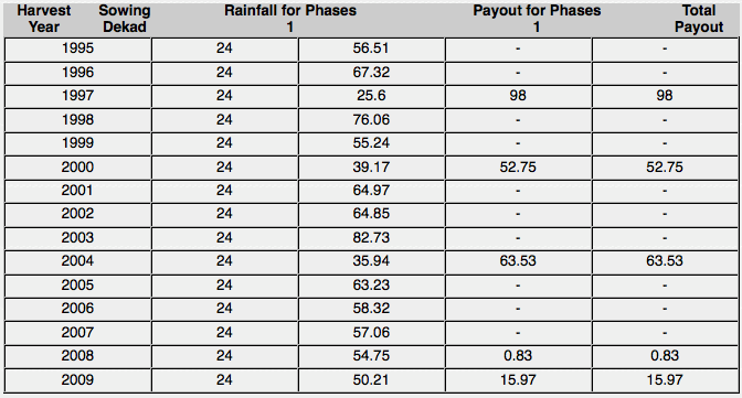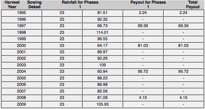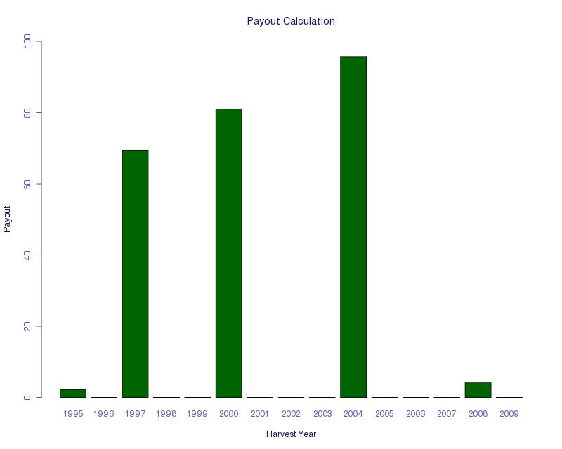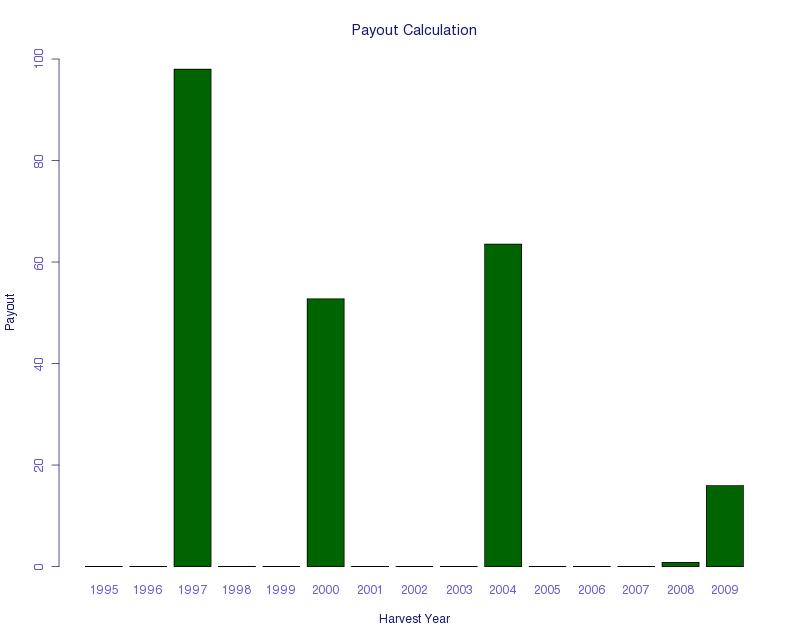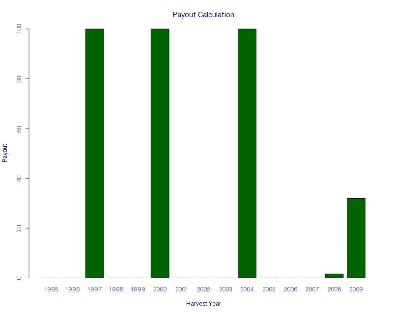 This index meets many of our design goals. It does not have too many large payments (which would increase the price), and it pays out in the very bad years mentioned by farmers. For most of the very bad years, there is a large payout, except for 2009, which would have had a relatively small payout.