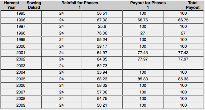 This index has a few limitations that will need to be discussed with farmers. It provides payouts in 1997 and 2008, which were not mentioned as drought years. From our rainfall data, 1997 is a very bad year. In discussions with experts, 1997 was a year with very low rainfall, so it is likely that it was actually a bad year, and we believe it would be a worthwhile payout.